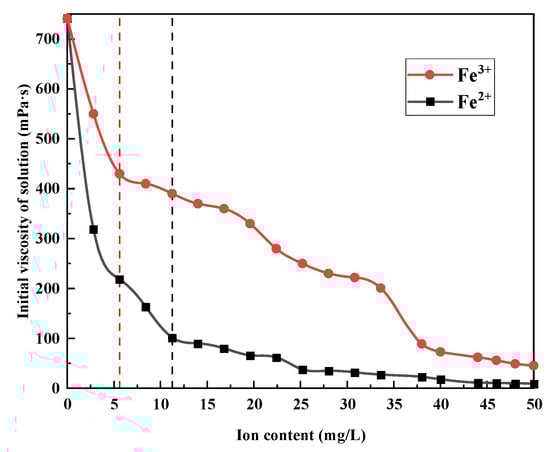 It can be seen from Figure 5 that a small amount of Fe2+ will cause a significant decrease in the viscosity of the polymer solution; as the Fe3+ content increases, the viscosity of the solution first decreases significantly and then decreases slowly. In aqueous solutions, Fe2⁺ ions catalyze the production of hydroxyl radicals through the Fenton reaction. These highly reactive oxidizing agents can disrupt the C-H bonds in polyacrylamide molecular chains [30]. This attack initiates a hydrogen abstraction reaction, leading to the formation of carbon-centered radicals, which in turn cause the molecular chains to break. As a result, the original long-chain polymers are transformed into smaller molecules, significantly reducing the viscosity of the polymer solution. Furthermore, the high charge density of Fe2⁺ ions enables them to effectively bind with the negatively charged functional groups on the surface of polymer molecules, leading to the compression of the diffusion double layer. This change reduces the repulsion between polymer molecules, causing them to move closer to each other, and subsequently undergo curling and aggregation. These structural changes reduce the hydration shell of the polymer, lowering the hydrodynamic radius of the solution, which further decreases its viscosity. In the compressed double layer environment, the free radical reactions catalyzed by Fe2⁺ ions more readily promote the breakage of polymer chains, as the charge shielding between molecules is weakened, making them more prone to contact and reaction [31,32,33]. Overall, the role of Fe2⁺ ions in polyacrylamide solutions is multifaceted. They not only trigger the oxidative degradation process but also alter the charge interactions between molecules, leading to changes in polymer structure and a significant decrease in solution viscosity [34]. When the Fe3+ content is 0~6 mg/L, the polymer solution decreases significantly. After reaching 6 mg/L, the polymer is observed to flocculate and settle, resulting in a decrease in solution viscosity. It can be seen that a trace amount of Fe2+ and Fe3+ can have a serious impact on the solution viscosity, and the impact of Fe2+ is greater than that of Fe3+. Therefore, the contents of Fe2+ and Fe3+ in the injected water need to be carefully controlled during on-site testing.