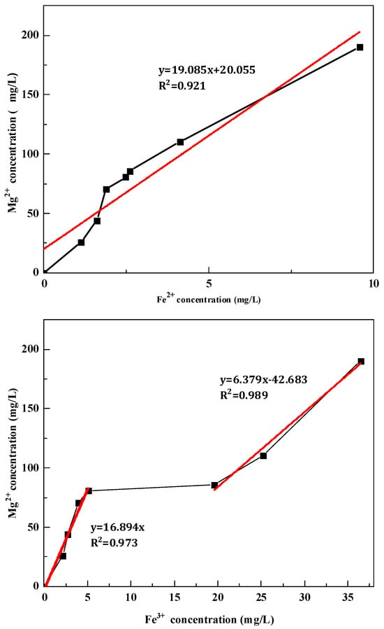 Linear fitting results of mass concentration of Fe2+ and Fe3+ corresponding to Mg2+ at the same viscosity.