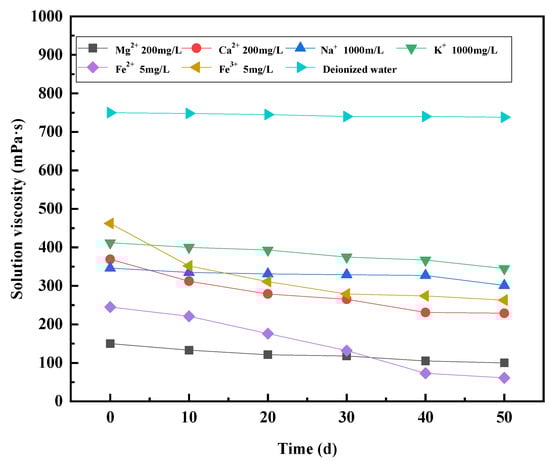In this study, we diluted the polyacrylamide mother solution with mineralized water of a certain concentration of Na+, K+, Ca2+, Mg2+, Fe2+, and Fe3+ to prepare a polymer solution (mass concentration: 2500 mg/L), and tested the polymer solution for 0–50 days.