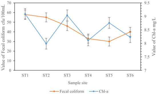 The monitoring of biological indicators included chlorophyll-a and fecal coliforms (Figure 4), chlorophyll-a, as the main component of chlorophyll, is closely related to the species and quantity of algae in the water, and its concentration affects watercolor, water quality, and primary productivity, serving as an indicative parameter, which reflects the nutrient level of the water body [62]. In the Waihu Reservoir, the concentration of chlorophyll-a was 8.54 ± 0.49 mg/m3, falling within the mesotrophic–eutrophic range (between 3.09 and 11 mg/m3), defined by the Organization for Economic Cooperation and Development (OECD) as a single indicator for the trophic status classification of lakes (reservoirs). No significant difference in chlorophyll-a concentration was observed between surface and deep water, suggesting that changes in water depth have minimal impact on chlorophyll-a concentration. Fecal coliforms serve as indicators of fecal contamination, primarily reflecting the presence of this bacterial group in the water [63]. The amount of fecal coliforms indicates the extent of fecal contamination and potential health risks. Fecal coliform counts at all monitoring sites at Waihu Reservoir met Class II water quality standards, indicating relatively low levels of fecal contamination from livestock and poultry farming activities within the reservoir area.
