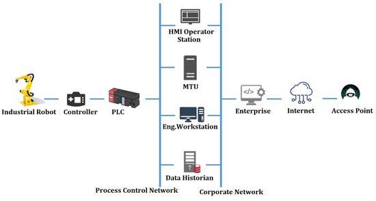 - Industrial Robots (IR): Industrial robots are mechanical, multi-axis “arms” that are commonly employed for automation, particularly in the industrial industry. All robots are complex automated manipulators that interact extensively with the physical environment. As a result, they are cyber-physical systems (CPSs), which include a variety of hardware and software components such as mechanics, controllers, human-interaction devices, firmware, operating systems, actuators, control logic, and sensors. Furthermore, the greater integration of digital monitoring of physical manufacturing activities connects robots both inside and with external services [16].