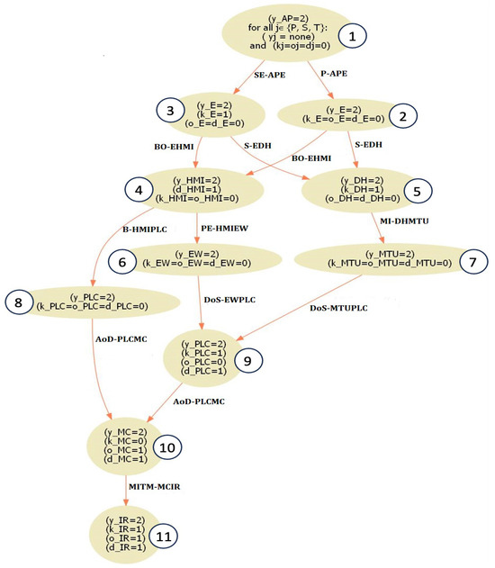 The attack graph demonstrated in Figure 2 simulates all possible paths an attacker may pursue to breach the system and interfere with IR functioning. Six distinct attack sequences that can be used by the attacker to breach the system are displayed in the attack graph, assuming that the attacker at the beginning only has access to AP and his/her intention is to disrupt the system by either altering the data entering IR or causing a delay from IR. Furthermore, each node shows the results of executing each attack as captured by the dynamic Boolean variables whose values change under attacks. These variables are as follows: gaining access to IR (yIR = 1); causing communication delay from IR (dIR = 1); the manipulation of data sent to target IR (oIR = 1); and information disclosure about IR (kIR = 1) [4]. Of course, the ultimate goal can be changed based on the attacker’s intention, and thus the attack graph termination node will also vary. Each arrow shows the name of the attack, the system from which the attacker is executing the attack, and the system against which the attacker is executing the attack. For example, SE_APE indicates that the attack is SE and the attacker used the system AP to attack system E. The attack graph will be extended including more details (incentives) to mimic the environment for the state–action–reward–state–action.