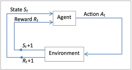 RL utilizes the MDP model for agent–environment interaction, as shown in Figure 3. MDPs define state spaces, representing all possible states that the agent can encounter, which is crucial for decision-making. They capture transitions between states based on selected actions and corresponding rewards. Discount factors modulate future rewards’ influence on current decisions. SARSA employs temporal difference learning to update action–value estimates, balancing exploration and exploitation to maximize rewards. This iterative learning approach enables agents to adapt behaviors for long-term objectives [41].