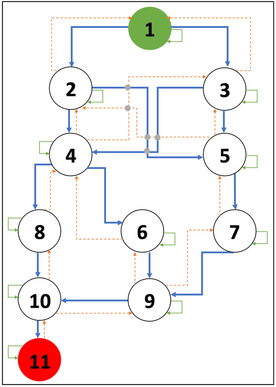 In addition, the CVSS overall scores from Table 1 are used to calculate the award values. The attacker will reach the target state and will remain there indefinitely. The blue lines represent the forward path, and their value changes based on the assault and its CVSS score. Any movement that is reversed—shown by the orange lines—will not earn the agent any reward. The reward will be −1 regardless of whether the agent remains in the same state or moves to a new node that is unlinked to the node it is now in, as indicated by the green lines.