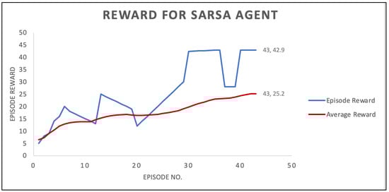 Determining the attacker’s/agent’s optimal path is a reflection of the agent’s training growth, as seen in Figure 5. The y-axis displays the cumulative reward for each episode, while the x-axis displays the total number of episodes. A total of 43 episodes were needed for the scheme to converge. The average reward after each episode is presented by the red line, which shows how the agent training has evolved. The cumulative reward for every episode is presented by the blue line. The graph identifies that as the episodes increase, the average reward increases, which implies that the agent’s training is getting better.