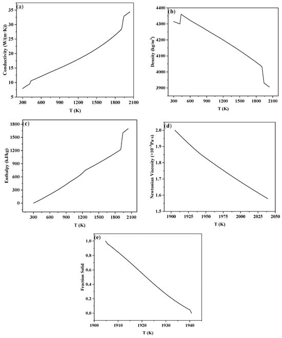 Physical parameters of the titanium alloy TC4: (a) thermal conductivity, (b) density, (c) enthalpy, (d) viscosity, (e) solid fraction.