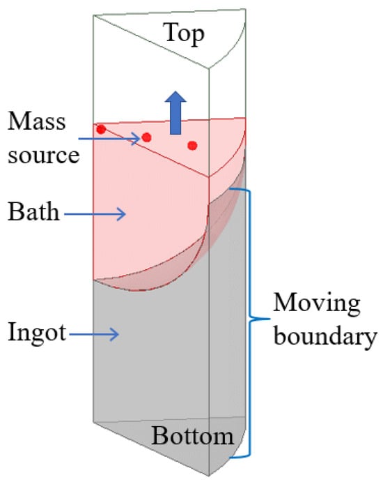 (1) In the process of vacuum arc remelting, the bottom surface of the consumable electrode will melt under the high temperature of the arc to form many metal droplets, which will continuously drop into the crucible to form a melting pool under the action of gravity. As the electrode continues to melt, the metal liquid level in the crucible continues to rise and solidify. According to the melting mode of the multi-point metal droplet melting in the melting process of the consumable electrode, the “multi-point mass source” is taken as the source of the mass source and heat source in the simulation process, where the sum of the mass source flow is the melting speed, and the temperature of the mass source is set according to the following empirical formula [,]: