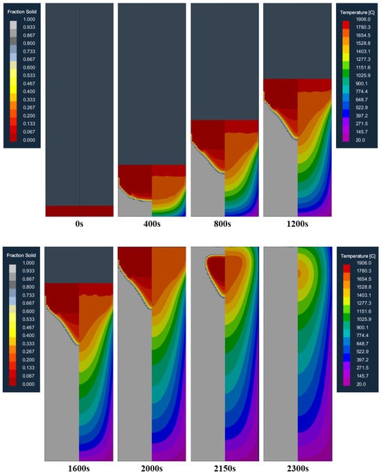 Figure 6 shows the distribution of the temperature field and the solid fraction at different moments in the longitudinal section of the model during the smelting process. As can be seen from the picture, at the beginning of melting, the molten pool can be effectively cooled at the bottom of the crucible so that the molten metal can rapidly solidify after entering the crucible, forming a flat and shallow molten pool (400 s). As the ingot increases gradually, the heat transfer to the bottom of the crucible is slowed down, and the heat released through the crucible is less than the heat released by the solidification of the liquid metal, and the accumulation of heat makes the molten pool gradually deepen. The shape of the molten pool gradually evolved from a flat shape to a funnel shape (800, 1200 s). With the increase in the depth of the molten pool, the contact area between the molten pool and the crucible wall increases, and the heat generation and dissipation in the crucible gradually reach a balance, forming a stable molten pool (1200, 1600 s), that is, reaching a stable melting stage. After that, the shape and depth of the molten pool do not change greatly until the electrode is melted (2000 s). After the electrode melting is completed, the ingot enters the capping stage. Affected by the radiation heat transfer on the top surface of the ingot, the top surface of the ingot begins to solidify, and the liquid core gradually shrinks until it is completely solidified (2150, 2300 s).