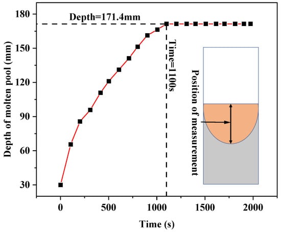 Figure 7 shows the variation of the molten pool depth over time by extracting the molten pool depth at different times in the melting process. It can be seen from the figure that after the beginning of smelting, the depth of the molten pool gradually increases, and it basically distributes linearly with time. At 1100 s, the depth of the molten pool reaches the maximum value of 171.4 mm, and then the depth of the molten pool remains unchanged. This is consistent with the results in Figure 6.