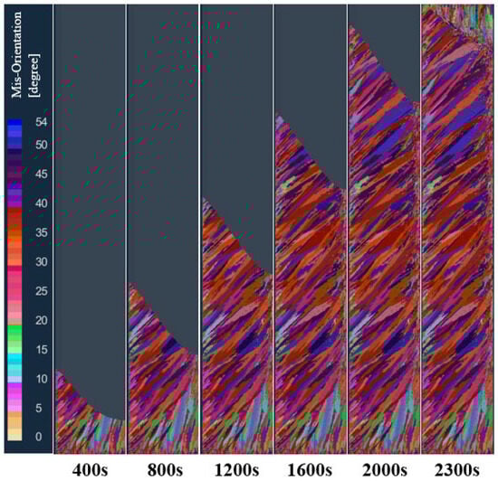 The solidification structure of the longitudinal section of the model at different times in the vacuum arc remelting process is shown in Figure 8. As can be seen from the figure, at the early stage of melting, when the high-temperature melt enters the water-cooled copper crucible, a layer of melt in contact with the crucible is strongly chilled. The bottom and wall of the crucible can be used as the heterogeneous nucleation base, so a large amount of nucleation near the crucible forms a thin layer of a fine grain zone on the surface of the ingot. As the melting proceeds, the latent heat of solidification continues to be released, which increases the melt temperature at the solidification front. At this time, the temperature gradient at the front of the solidification interface is large, and some fine grains grow in the form of dendrites. These preferentially grown dendrites form a columnar crystal zone with a certain preferred orientation. When the smelting enters the final stage, the melt temperature in the molten pool of the ingot continues to decrease, and there is enough heterogeneous nucleation substrate in the remaining melt at the center of the ingot, so the nucleation is almost simultaneous in the remaining melt, and the grains grow freely in the melt. The formed equiaxed crystal hinders the growth of columnar crystals, and the transformation of the columnar crystal to an equiaxed crystal occurs. Therefore, there are typically three crystal regions in the solidification structure of the vacuum arc remelting titanium alloy ingot: the surface fine crystal region, columnar crystal region, and central equiaxed crystal region.