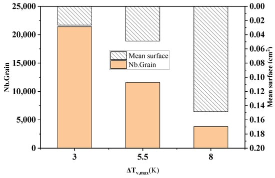 Figure 10 shows the comparison of the statistical results of the grain number and average grain area at different maximum bulk nucleation undercooling levels in the longitudinal section of the model at the end of solidification. As can be seen from the figure, when the maximum bulk nucleation undercooling increases from 3 K to 8 K, the solidification grain number decreases sharply from 21418 to 3818, with a decrease of 82.2%. The average grain area increases from 0.0265 cm2 to 0.149 cm2, with an increase of 82.2%. This echoes the simulation results in Figure 9.