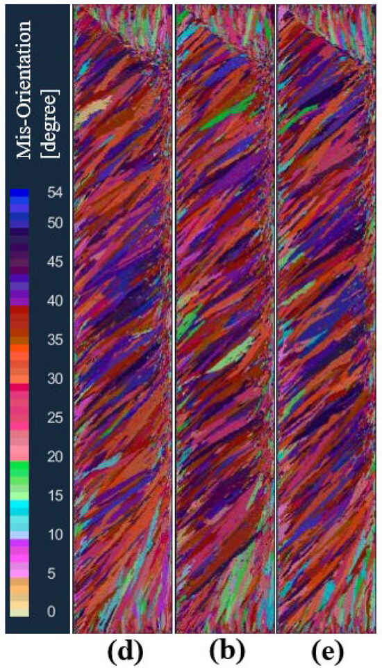 In order to study the influence of the standard deviation of the maximum body nucleation on the solidification structure of the ingot, under the condition that other nucleation parameters and process parameters remain unchanged, the schemes d, b, and e set the maximum body nucleation standard deviation to 2 K, 4 K, and 6 K, respectively, for the solidification structure calculation. Figure 13 is the solidification structure comparison of different maximum body nucleation standard deviations at the longitudinal section of the model after melting. It can be seen from the figure that the standard deviation of the maximum body nucleation increased from 2 K to 6 K, and the solidification structure did not change significantly.