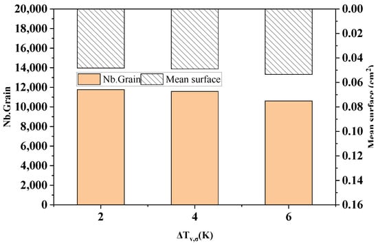 Figure 14 shows the comparison of the statistical results of the grain number and average grain area at different standard deviations of the maximum body nucleation in the longitudinal section of the model after solidification. As can be seen from the figure, when the maximum body nucleation standard deviations are 2 K, 4 K, and 6 K, the solidification microstructure grain numbers are 11,759, 11,583, and 10,612, which decrease slightly by 1.5% and 8.4%, respectively. The average grain areas are 0.0482 cm2, 0.0490 cm2, and 0.0535 cm2, respectively, and slightly increased by 1.5% and 9.1%, respectively.