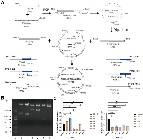 Figure 1. Construction of Chlamydomonas ptoxs-RNAi mutant strain. (A) Construction process of the pH124-ptoxs-RNAi plasmid. (B) Identification of vector pH124-ptoxs-RNAi by restriction analysis. 1, pH124-ptox2-RNAi/Pmac I + Nhe I; 2, pH124-ptox1-RNAi/PmaC I + Nhe I; 3, pH124-ptox2-RNAi/EcoR I; 4, pH124-ptox1-RNAi/EcoR I; 5, pH124/EcoR Ⅰ; 6, pH124 vector without digestion. (C) Selection of high-efficiency silence transgene Chlamydomonas reinhardtii R1 and R2. The results represent three independent experiments (n = 3). Data represent means ± SD. * p < 0.05, *** p < 0.001, or “ns” for not significant.