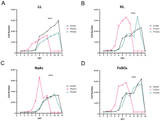 Figure 2. The growth curves of PTOX knockdown cells under stress. Growth curves of wild-type (CC849) and ptox mutants (PTOX1i and PTOX2i) under different conditions. (A) The growth curves of wild-type (CC849) and ptox mutants (PTOX1i and PTOX2i) under normal conditions. (B) The growth curves of wild-type (CC849) and ptox mutants (PTOX1i and PTOX2i) under high light culture conditions. (C) The growth curves of wild-type (CC-849) and ptox mutants (PTOX1i and PTOX2i) under high light culture plus 45 mM NaAC treatment condition. (D) The growth curves of wild-type (CC849) and ptox mutants (PTOX1i and PTOX2i) under high light culture plus 4450 μM FeSO4 treatment condition. The results represent three independent experiments (n = 3). Data represent means ± SD. *** (CC849 versus PTOX1i, CC849 versus PTOX2i) p < 0.001. LL, normal conditions; HL, high light culture condition; NaAc, 45 mM NaAC condition; FeSO4, 450 μM FeSO4 condition.