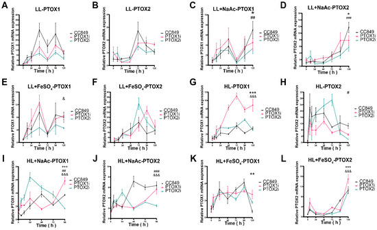 Figure 3. ptox1 and ptox2 differential expression under stress conditions. Relative mRNA expression levels of ptox1, 2 genes of wild-type (CC849), and ptox mutants (PTOX1i and PTOX2i) under different conditions. (A) The expression of ptox1 under normal conditions. (B) The expression of ptox2 under normal conditions. (C) The expression of ptox1 under 45 mM NaAC treatment. (D) The expression of ptox2 under 45 mM NaAC treatment. (E) The expression of ptox1 under 450 μM FeSO4 treatment. (F) The expression of ptox2 under 450 μM FeSO4 treatment. (G) The expression of ptox1 under high light culture conditions. (H) The expression of ptox2 under high light culture conditions. (I) The expression of ptox1 under high light culture plus 45 mM NaAC treatment. (J) The expression of ptox2 under high light culture plus 45 mM NaAC treatment. (K) The expression of ptox1 under high light culture plus 450 μM FeSO4 treatment. (L) The expression of ptox2 under high light culture plus 450 μM FeSO4 treatment. * (CC849 versus PTOX1i) p < 0.05, ** (CC849 versus PTOX1i) p < 0.01, *** (CC849 versus PTOX1i) p < 0.001, # (CC849 versus PTOX2i) p < 0.05, ## (CC849 versus PTOX2i) p < 0.01, ### (CC849 versus PTOX2i) p < 0.001, & (PTOX1i versus PTOX2i) p < 0.05, &&& (PTOX1i versus PTOX2i) p < 0.001. The results represent three independent experiments (n = 3). Data represent means ± SD.