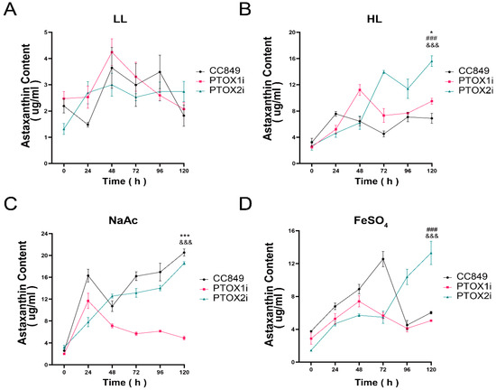 Figure 4. Astaxanthin production under stress conditions. Astaxanthin accumulation (μg/mL) of wild-type (CC849) and ptox mutants (PTOX1i and PTOX2i) under different conditions. (A) The astaxanthin production of wild-type (CC849) and ptox mutants (PTOX1i and PTOX2i) under normal conditions. (B) The astaxanthin production of wild-type (CC849) and ptox mutants (PTOX1i and PTOX2i) under high light culture conditions. (C) The astaxanthin production of wild-type (CC849) and ptox mutants (PTOX1i and PTOX2i) under high light culture plus 45 mM NaAc treatment condition. (D) The astaxanthin production of wild-type (CC849) and ptox mutants (PTOX1i and PTOX2i) under high light culture plus 4450 μM FeSO4 treatment condition. * (CC849 versus PTOX1i) p < 0.05, *** (CC849 versus PTOX1i) p < 0.001, ### (CC849 versus PTOX2i) p < 0.001, &&& (PTOX1i versus PTOX2i) p < 0.001. The results represent three independent experiments (n = 3). Data represent means ± SD. LL, normal conditions; HL, high light culture condition; NaAc, 45 mM NaAC condition; FeSO4, 450 μM FeSO4 condition.