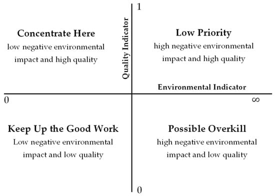 The aggregation and interpretation of the quality and environmental indicators are carried out according to the modified IPA model (importance-performance analysis) [45]. This model is universal and allows one to determine the direction of product development in terms of any aspects whose values have any scale of assessment. It was considered reasonable in this procedure because the quality-level values range from 0 to 1, while the environmental load values may vary (depending on the product type, system boundaries, functional unit, etc.). Detailed characteristics of IPA are presented in the literature on the subject, e.g., in [31]. Due to this fact, IPA is assumed to be created according to the value of the weighted quality level and the weighted environmental impact, as shown in Figure 2.