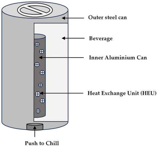 The system that supports the cooling of the beverage in the can causes endothermic desorption of carbon dioxide (CO2), which is previously adsorbed in the activated carbon (AC) beds. It is inside the can. The outer part of the box is made of galvanised steel, while the inner part is made of aluminium. The internal part constitutes the heat exchange unit (HEU) and is composed of activated carbon, which prevents the contact of the drink with the activated carbon. Furthermore, the use of HEU increases the size of the can compared to traditional cans. Cooling is started using the button located at the bottom of the can. Then the valve activates the pressure outside the HEU, and the CO2 ventilation process begins. It is assumed that ideal conditions will allow the drink to cool down to even 15 °C [51]. The technological process of self-cooling cans is shown in Figure 4.