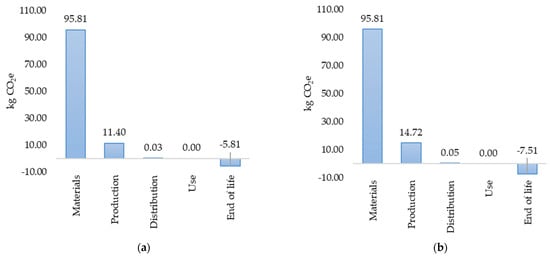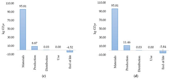The largest amount of the carbon footprint (96 kg CO2e) is generated during the can distribution phase. This result is mainly due to modelling the data to include one piece of a beverage cooling can. These conclusions are confirmed by, among others, studies [48,52,53,54] that also state that the distribution phase of this type of product is associated with significant environmental burdens. However, if the number of cans transported was greater, a greater environmental impact would be observed in the remaining phases of the life cycle. Among other things, the greater amount of carbon footprint is in the production phase of the self-cooling beverage cans (from approximately 9 to 12 kg of CO2e) and, subsequently, in the acquisition and extraction of materials (from 0.03 to 0.05 kg of CO2e). It was also observed that, in the end-of-life phase (including recycling), these emissions range on average from −4.52 to −7.51 kg of CO2e. A detailed analysis of the carbon footprint in the life cycle of a self-cooling beverage can and its variants is presented in Table 5, which includes a statistical analysis consisting of calculating the change in value, in %, as the difference in the value of environmental load and the average value of these loads by their average value.