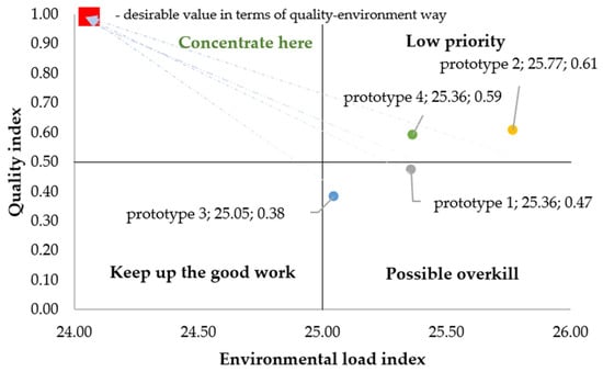 The “concentrate here” area is the most favourable and indicates that the product quality and its environmental impact are satisfactory, i.e., high quality and low environmental impact. This area means that the product can be improved, but its current condition is satisfactory to the customer and has the lowest possible negative impact on the environment. The area of “keep up the good work” is a promising area but requires further improvement—mainly in the qualitative area. During the process of improving product quality, remember to maintain or, if possible, minimise the environmental impact. The “low-priority” area means that the product may be of high quality, but its environmental impact is high. Therefore, it is not desirable to achieve this in the era of sustainable product development. Similarly, the “possible overkill” area presents both a high negative environmental impact and a low level of quality. This indicates low customer satisfaction and environmental neglect.