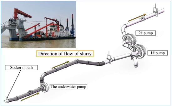 The research work of this paper is based on existing engineering data, which were collected by suction dredger as shown in Figure 1. During the work process, the CSD uses the underwater pump to collect the mud underwater and the mud is transported through the pipe to the target location; this work needs more than one pump to be complete, as shown in Figure 1. During the process, the underwater pump will produce negative pressure in front of the pump, causing the mud to enter the pipeline through the suction port. Due to the lifting effect of the 1# pump, the mud will then flow from the bottom to the water surface, and then the 2# pump will cause the mud to be transported to the target location.