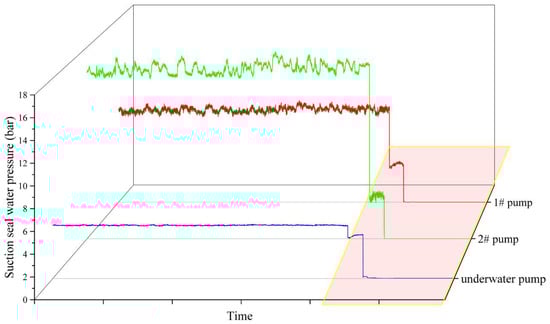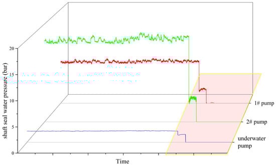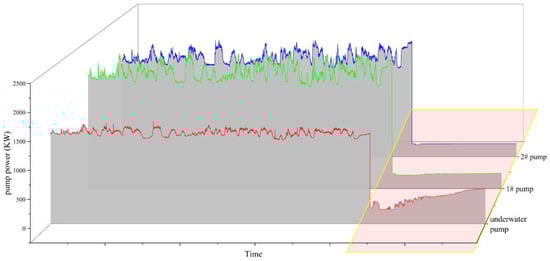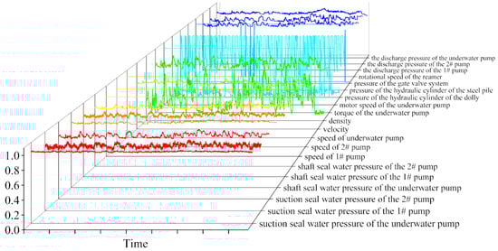 The data analysis must be based on the data generated in the actual production process of the dredger; that is to say, it is necessary to filter out the abnormal data in the non-operational stage, which can significantly improve the accuracy of the results. Establishing the state of the ship’s operation process should be a stable basis for judgment. Figure 4, Figure 5 and Figure 6 illustrate part of the key data of the three mud pumps in the ship’s operation process under three parameter changes. The highlighted part of the data for each parameter illustrates a sudden change in the situation where the parameter has stabilized in a smaller value. This shows that the mud pump may be in an idle state, which means that the ship is very probably in a non-operational state. However, even if the pump is not idling, the data should be processed in the data cleaning phase to be on the safe side, considering that each data item has a sudden change and stabilizes at a relatively small value.