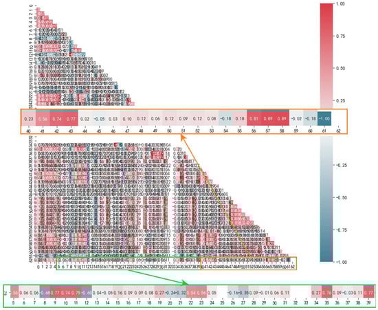 The correlation coefficient results are presented in the form of a heat map, and the results are shown in Figure 10. The values on the intersection position of the two parameter items represent their correlation coefficients. The larger the value, the redder the color, and the stronger the correlation is. On the contrary, the lower the value, the bluer the color of the square, which indicates that the correlation is weaker []. Because of the need to analyze several feature items, all feature items are numbered in the correlation analysis of this paper. No. 62 represents the underwater pump vacuum to be analyzed in this paper, and its correlation results with other feature items are expressed in the 62nd line with the intersection position of the other feature items.