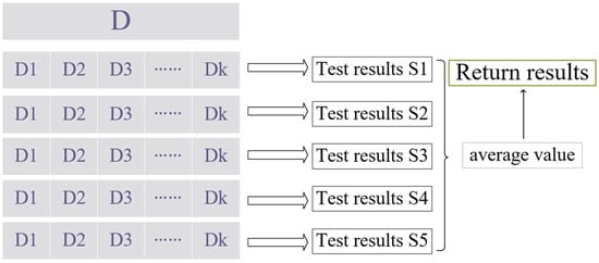 Before starting to train the model, the data need to be split into a training set and a test set, to avoid overfitting in the process of model training. In this study, the K-fold cross-validation method, the principle of which is shown in Figure 11, was chosen to split the data. The data set D was divided into K equal proportions, with one of the copies as the test data, and the other K-1 copies as the training data. Then, a different copy was used as the test set, and the other copies were subjected to relatively independent model training as the training set. The cross-validation was repeated K times until all individual copies had been used as the test data. Finally, the results of the K experiments were divided equally.