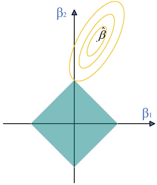 Figure 12 shows the lasso regression estimation plot. The square area represents the constraint function area, and the yellow border line is the least squares error function contour. Because the constraint domain of lasso is square, this will produce points tangential to the coordinate axis, which causes some of the dimensional features to be weighted at 0. Therefore, it is easy to produce sparse results, so the lasso method can achieve the effect of variable selection, and the non-significant variable coefficients will be compressed to 0.