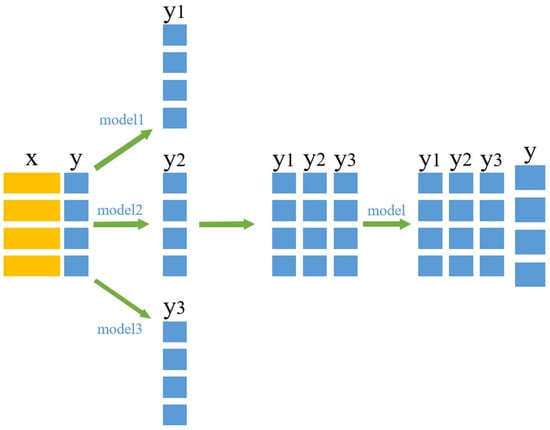 The purpose of integrated learning is to obtain a strong model by combining many weak models, as shown in Figure 13, where y1, y2, and y3 represent three base models, and x and y represent the target term and the set of feature parameters. The model first learns the original data through the base learners, and models the stack of the original fitted data. Then, all these base learners output the original data, and the outputs of these models are stacked in columns to form (m, p)-dimensional new data, with m representing the number of samples and p representing the number of base learners. Finally, the new sample data are given to the second layer model for fitting [,,].