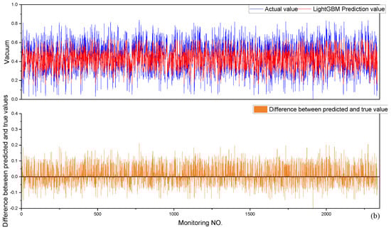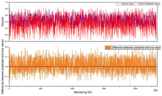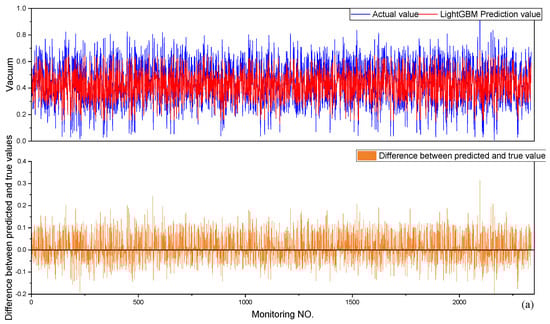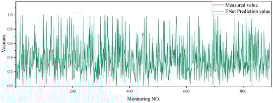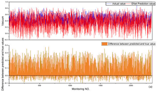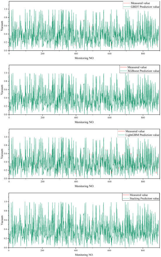 GBDT and stacking achieve a better fit, but both of them take more than 10 s, much longer than the other models. The ENET model and LightGBM model show a better timeliness and fitting effect in the prediction process; both of them lose part of the accuracy, but greatly accelerate the speed of convergence of the model. In particular, ENET achieves faster convergence with better fitting data and higher accuracy. Therefore, it is recommended to use the ENET model and LightGBM model to carry out underwater pump vacuum prediction, which can help to reduce the hardware requirements, obtain a high frequency of acquisition and prediction, and reduce the data delay; engineering applicability is also better [,].