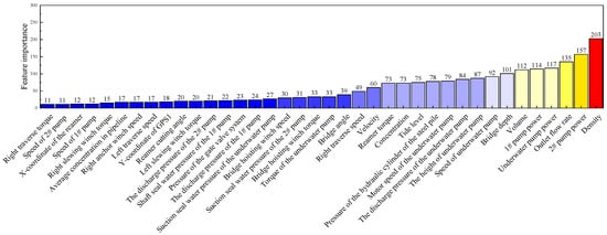 In order to study the importance of each data item for the prediction of underwater pump vacuum, this project used the LightGBM algorithm to calculate the importance of 56 parameters other than the vacuum in the model prediction process. Of these, 38 features show obvious influence in the process of model training, as shown in Figure 15, where the values are dimensionless quantities, and the difference in the size of the relative influence corresponds to the magnitude of the performance. From this, it can be seen that in the prediction of underwater pump vacuum, density and 2# pump power are very important. In addition, the outlet flow rate, compass angle, underwater pump power, and 1# mud pump power are also important, while the importance of the volume, bridge depth, and underwater pump speed cannot be ignored. The above seven features show a strong influence in the process of underwater pump vacuum prediction, while from the previous correlation analysis, we know that there is a strong correlation between vacuum and volume, density, underwater pump speed, bridge depth, outlet flow rate, concentration, flow rate, underwater pump power, 1# pump power, and 2# pump power. It has been stated that the size of the correlation coefficient in the actual prediction stage is the basic criterion for the initial feature screening, and here, the results of the correlation analysis are combined with the prediction results to show that density, volume, outlet flow rate, concentration, flow rate, underwater pump power, 1# pump power, and 2# pump power have a greater impact on the prediction effect of the underwater pump vacuum degree.