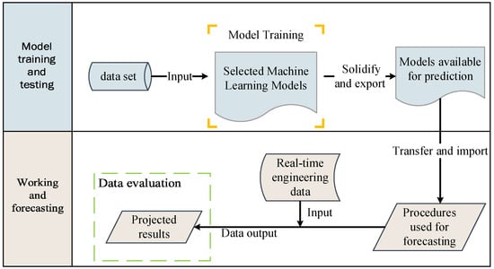 Considering the complexity of the actual engineering environment, as well as the pressure of model training on the equipment environment, in this study, we decided to evaluate the training and prediction of a variety of machine models. At the same time, the model training and vacuum prediction were designed as relatively independent work modules, and the predictive model was stored in a file between model training and validation use. By separating the model training and learning from the engineering use, the method has the flexibility required for the engineering application, but it also places higher requirements on the imported data. As shown in Figure 18, the method proposed in this paper takes model training as the work content of the shore operation, the offshore module is the module with the prediction function, and the model is overwritten by importing the model file, which can be realized through a variety of file transfer methods. The technical approach provided in this paper requires that the feature items imported by the shipboard prediction program be consistent with the feature items of the data set used for model training, which includes the format, number, and content of the feature item indexes, since differences in the feature items may lead to compatibility problems with the model.