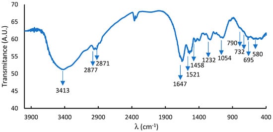 FTIR accounts for the bands corresponding to the functional group of the material under study. The FTIR spectrum of the dry sample evidenced an aminopyranosic structure (Figure 2). According to the FTIR data, the -OH stretching frequency emerged at 3413 cm−1. The CO (amide) and NH primary amine bands were observed at 1647 cm−1 and 2877–2871 cm−1 (CH2 stretching), while the vibrational mode of amide C=O stretching was observed at 1672, and the NH primary amine bends were observed at 1647 cm−1. The absorption bands at 1521 and 1396 cm−1 correspond to amide II (N-H bending) and amide III (C-N stretching), respectively []. The band at 1458 cm−1 was attributed to the C−H side-chain bending -CH2OH. The band at 1232 cm−1 (C−O−C stretching) and the absorption band between 1220 and 1054 cm−1 represent the free amino group (−NH2) at the glucosamine C2 position. The 1068 and 1054 cm−1 absorption peaks were assigned to C−O glucose bending. The peak at 771 cm−1 was ascribed to C−N stretching at 732 cm−1 (out-of-plane bending NH) and 561 cm−1 (out-of-plane bending NH, out-of-plane bending C−O) [,,,,,,].