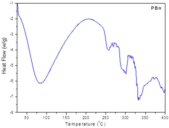 The DSC analysis of PBn shows a glass transition temperature of 32 °C (Figure 4). PBn has an endothermic peak at 211 °C, corresponding to the melting temperature, similar to those reported for chitin films at 219 °C []. Above 250 °C, the polysaccharide chains begin to decompose [].