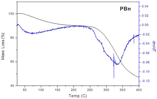 The thermogravimetric analysis—differential thermal analysis (TGA-DTGA) performed on the PBn film with a heating rate of 10 °C/min shows the thermal characteristics of a polysaccharide (Figure 5). In this experiment, PBn underwent three stages of mass loss: (i) the water evaporation of PBn between 50 °C and 100 °C, (ii) the decomposition temperature was measured to be at 250 °C, and (iii) it finished at 400 °C. During the decomposition process, the PBn chains begin to degrade and, finally, the biopolymer matrix completely decomposes at 330 °C [,,].