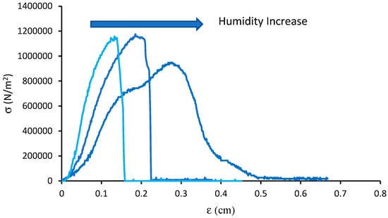 The tensile test (mechanical test) of a material consists of subjecting a standardized specimen to an increasing axial tensile stress until it breaks. This test measures the resistance of a material to a static force. Previous studies [,] have shown that films’ tensile stress–strain curves present a fine correlation between the breaking stress and strain for a humid sample.