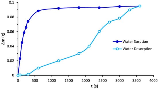 The water vapor sorption isotherm shows the equilibrium amount of vapor adsorbed at a constant temperature (Figure 8). An increase in mass can be observed due to the water vapor permeability, with a value of 3.74 ng m/m2 s Pa. This value is due to the PBn structure, which has a great affinity for water. This phenomenon is caused by the interaction between the hydrophilic groups of PBn and the water molecules, as observed during the initial step of water vapor sorption (during the first 30 min, see Figure 9).