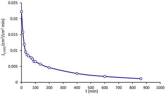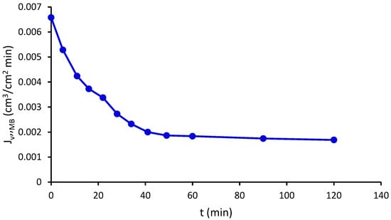 Our permeability studies used the PBn films as a barrier between two sides: one side contained water or an MB aqueous solution, the other side accumulated the water and part of the MB passing through the membrane. The experimental results obtained for the pure water flux and MB flux through the PBn film are shown in Figure 10 and Figure 11, respectively.