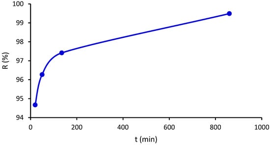 In this work, the MB rejection amount is between 94% and 99%, which shows that PBn is a suitable material for MB removal from waste water (Figure 13). The rejection of MB may be due to two combined phenomena, the first a simple size exclusion and the second the great affinity of PBn for water. Although the exclusion due to size is not total, since the membrane allows for the passage of some MB molecules, these molecules accumulate in the pores and end up excluding it. The formed cake only allows for the passage of the MB molecules and not of water ones, because the PBn material is hydrophilic.