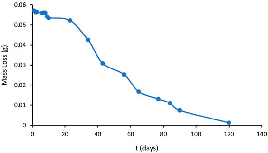 In the initial stage, microorganisms start the material’s degradation with a rapid mass loss during the first days. Then, from day 10 to day 45, a plateau stage is reached with an almost constant weight (intermediate stage), when the PBn biodegradation rate is nearly zero. After 45 days, during the last stage, the mass decreases significantly until total degradation takes place (day 90). Generally, the biodegradation of chitin and chitosan occurs over 25 days or more [,,].
