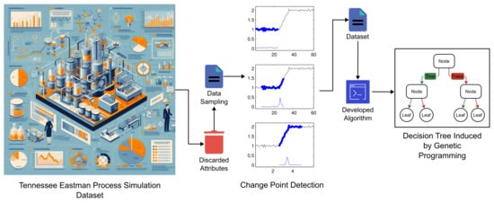 The FDI framework introduced in this paper is composed of two key modules: change point detection and fault classification, as illustrated in Figure 1. To initiate the analysis, we employed the Tennessee Eastman Process Simulation Dataset, selectively discarding certain attributes and applying data sampling. The sampling procedure used the change point detection method, which combines fuzzy set theory with the Metropolis–Hastings algorithm, resulting in the creation of a new dataset. The new dataset was then utilized by the developed classification algorithm, which is the primary contribution of this paper. This algorithm utilizes genetic programming to induce decision trees, serving as solutions to the fault classification problem. The integration of these modules enhances the overall effectiveness of the FDI framework, providing a comprehensive approach to detecting changes and classifying faults in complex systems.