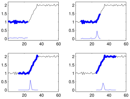 where is a noise signal. Figure 2 shows several time windows with fixed size (24 samples) from the time series given by (2) with 60 samples (x-axis). Notice that in each subfigure of Figure 2, the time series is depicted at the top as a thin black line, the time window illustrated by the blue thick line, and the obtained results (likelihood of a changing point’s occurrence across window samples) are depicted as a blue thin line at the bottom. It is evident that the likelihood of a change point is around 30%.