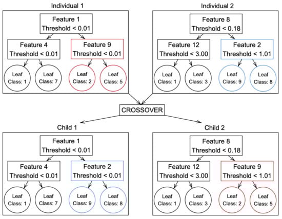 In order to improve and adjust the decision trees produced, our algorithm integrates principles of genetic programming [36]. Inspired by the principles of natural selection, which involve selection, crossover, and mutation, new generations of trees are systematically created with the aim of improving the adaptation to the training data. Through iterations, individuals within the population evolve, resulting in the development of more effective decision trees for data classification [37].