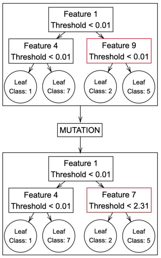 In the mutation process, a node within the tree is randomly chosen. Subsequently, both the attribute and the threshold of this node undergo random modifications. If the selected node is a leaf node, the associated target class is subject to random alteration. This involves randomly selecting a target class from the dataset and assigning it to the leaf node, thereby introducing variability into the tree structure. This iterative process empowers the population to explore different paths and potentially uncover more effective solutions to the classification problem [38]. The mutation process is visually depicted in Figure 5.