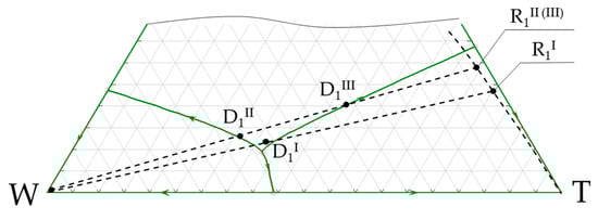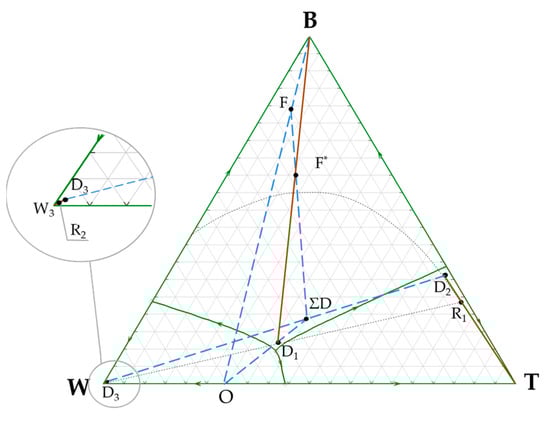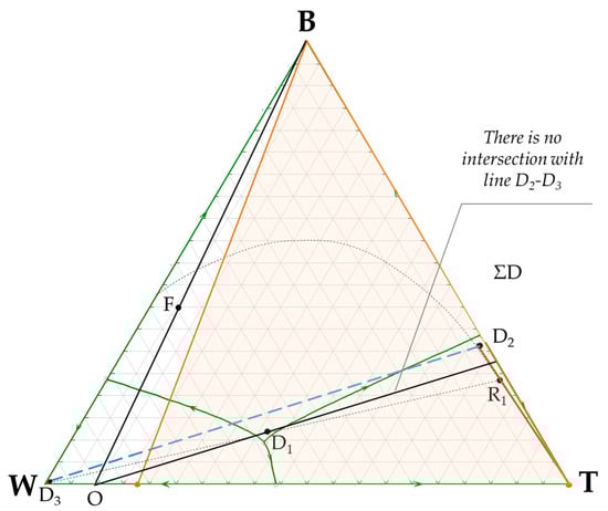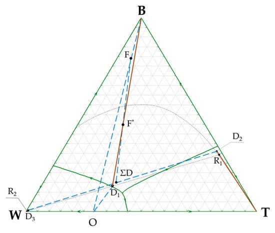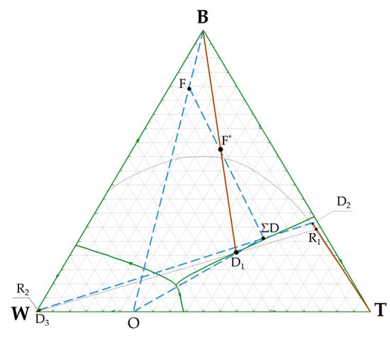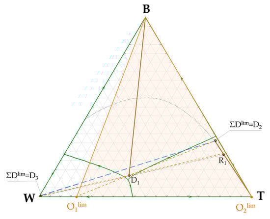 Line D3–D1 intersects the boundary of composition triangle B + T; however, since point O must belong to the binary constituent W + T, O2lim coincides with the point of the pure toluene. The region of the flowsheet’s operability is highlighted in color in Figure 7. In accordance with Equation (3), the boundaries of the operability region will be lines B(W1)-O1lim and B(W1)-O2lim. It is possible to build a balance net for any composition within this region (the construction technique is described above); lines O-D1 and D2–D3 will always intersect.
