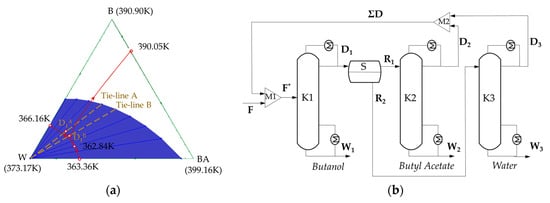 Phase diagram of n-butanol (B) + butyl acetate (BA) + water (W) ternary mixture at 101.3 kPa (a) and flowsheet of its separation (b) (M1, M2—mixers, S—separator, K1, K2, K3—distillation columns).