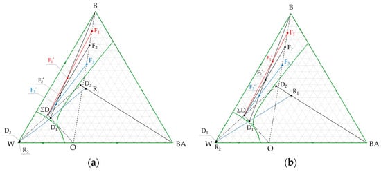 Lines of material balances for various spatiotemporal contours of the separation flowsheet for ternary n-butanol (B) + water (W) + butyl acetate (BA) mixture of different original compositions: (a)—for tie-line A, (b)—for tie-line B: D1–D3—the compositions of distillate flows of columns K1–K3; F—the composition on original mixture; F*—the composition of feed flow to the column K1; R1 and R2—the compositions of liquid layers in separator.