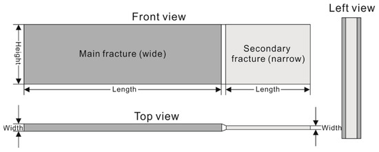 Based on the actual characteristics of the strata, the rock fracture width of carbonate reservoirs in the Tahe oil field varies from 0.001 mm to tens of millimeters [41]. A fracture-shrinking structure has been established, as depicted in Figure 1 to serve as a foundation for simulating fracture plugging under varying conditions such as particle size, fluid velocity, and particle concentration. The main fracture measures 1.2 m in length with a width of 8 mm and height of 0.2 m, transitioning into a narrow fracture structure through localized necking. The narrow fracture is 0.4 m in length with a height of 0.2 m. The main fracture is undergoing a transition to a narrow fracture structure via localized necking, while the joint angle of the three distinct joint combinations remains fixed at 7.125°. Table 1 lists the geometric parameters of the models.